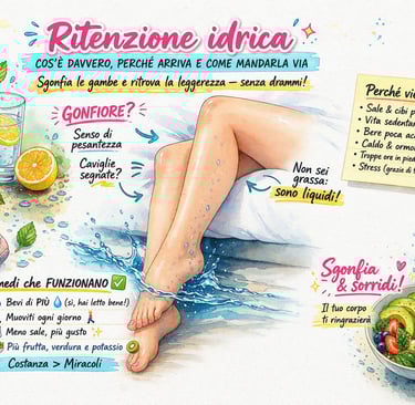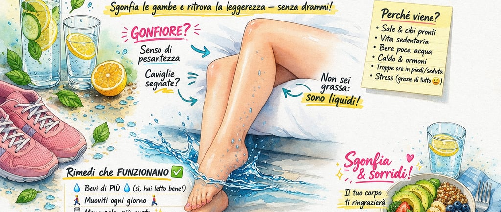 Ritenzione idrica: cause, sintomi e rimedi utili per combattere gambe gonfie e senso di pesantezza. Guida semplice, ironica e pratica.